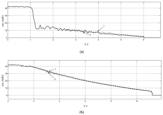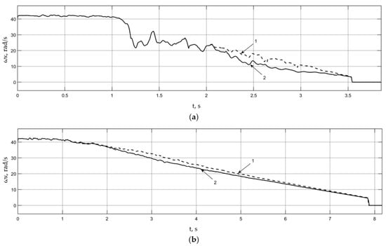 To confirm the effectiveness and efficiency of equipping the braking control system with the function of suppressing self-oscillations using the experimental research method, it is necessary to compare the braking processes of a car equipped with the specified function and without it, comparing the implementation of angular velocities, braking torques, and deceleration trajectories.