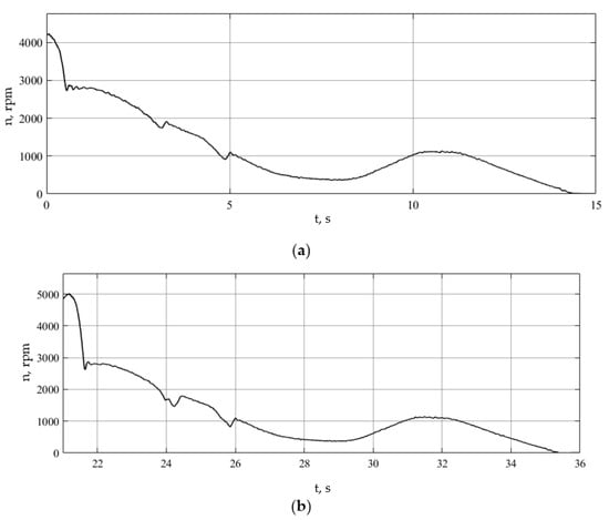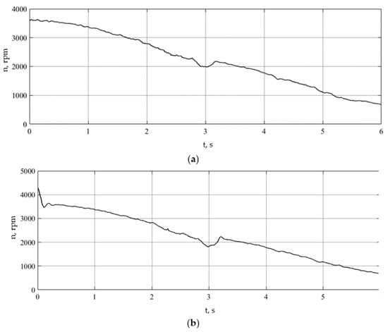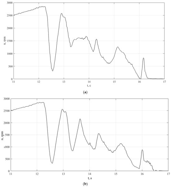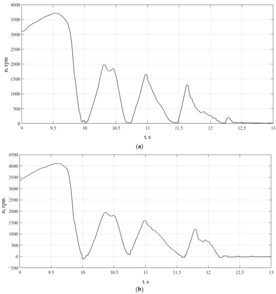 Wheel rotation speed with the vibration suppression system activated, run No. 2: (a) left; (b) right.