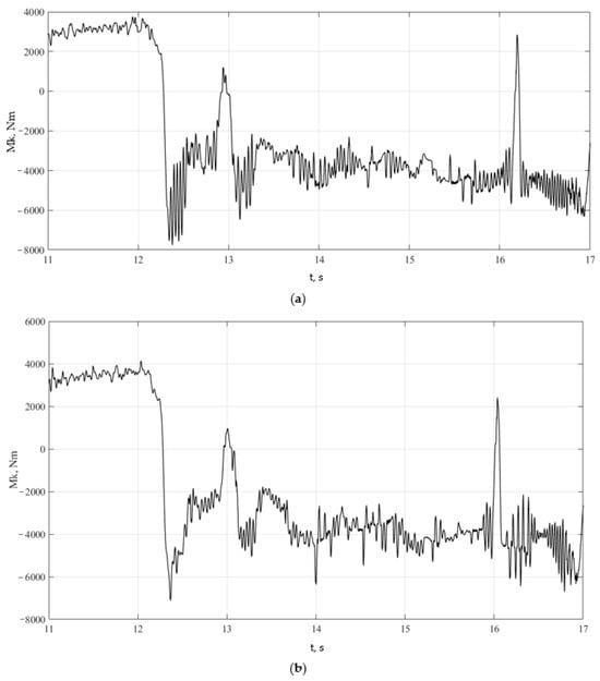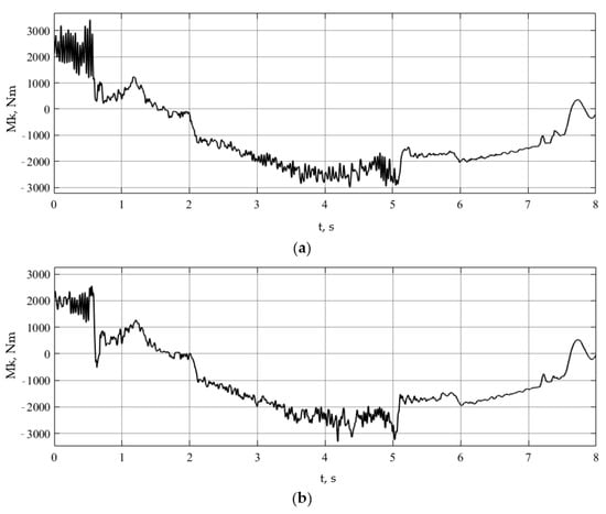 Torque on the wheel with the vibration suppression system deactivated, run No. 2: (a) left; (b) right.