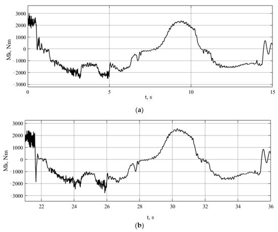 Torque on the wheel with the vibration suppression system deactivated, run No. 3: (a) left; (b) right.
