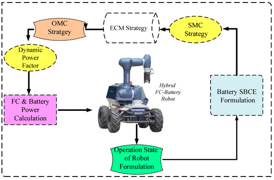Nowadays, the field of electrified mobile robot design and construction is experiencing continuous growth and advancement. The combining of a power supply (fuel cell, photovoltaic, etc.) with an energy storage system (battery, supercapacitor, etc.) in a robot propulsion system represents a hybrid electric robot concept [1]. This hybridization offers potential solutions to overcome the challenges associated with pure electric robots. In the first case, if only batteries are used as the energy source, they will encounter numerous obstacles including low power density, voltage drop, and inefficiency performance. Also, if only fuel cells are used as the energy source, the fluctuations of the demanded power can reduce the life span of the fuel cell. Consequently, the fuel cell electric robot is usually equipped with batteries or supercapacitors as an auxiliary energy source [2,3].