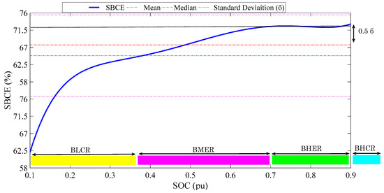 In this equation, ηSBCEi represents the SBCE for various SOCs, and PSBCE (ηSBCEi) represents the corresponding probability distribution function for different SOCs of the LiFePO4 battery. This PDF follows a uniform distribution in the range of (0.1, 0.9) pu for the SOC. In this study, the dispersion of the SBCE and the SOC range were analyzed using the dispersion index of the standard deviation, after calculating μSBCE.