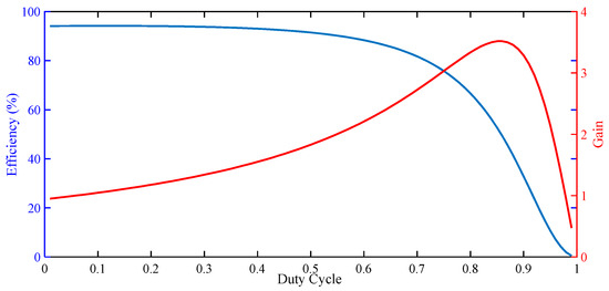 Efficiency–duty cycle and gain–duty cycle curves of the step-up converter.