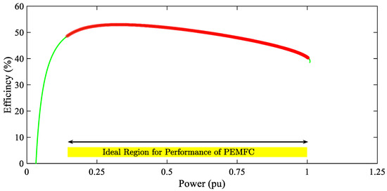 Figure 7 displays the efficiency–duty cycle curves and voltage gain–duty cycle curves for a modular structure of the DC-DC step-up converter on a per-unit basis, as determined by the equations discussed in the previous sections of this research. Figure 8 displays the overall efficiency (ηtot) of the fuel cell system, which is determined by multiplying the efficiency of the fuel cell and the step-up converter connected to it, after calculating the efficiency of the stack and the converter. The figure indicates that the system’s efficiency is significantly lower than expected for output powers below 0.17 pu. To optimize its usage, this research demonstrates the appropriate operating range for PEMFC (PFC ϵ (0.17, 1) pu) in Figure 8.