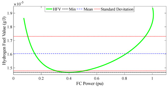 The variable represents the rate at which hydrogen is consumed per joule of energy under various power conditions. The variable represents the probability distribution function associated with uniform distribution in the per-unit interval (1, 0). In this study, after computing μHC, the aim is to examine the distribution of the hydrogen consumption rate per joule of energy and separation. The variability of the standard deviation index is utilized to ascertain the operational thresholds of the fuel cell.