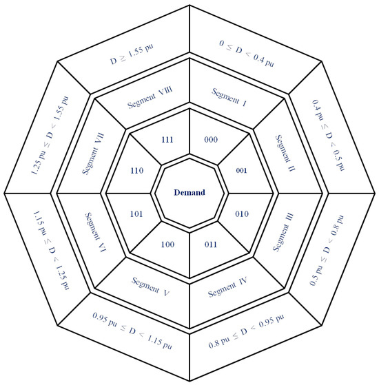 Figure 5 displays the SBCE of the LFP battery, along with its mean value and standard deviation, for various SOCs of a LiFePO4 battery cell operating at its rated power. The maximum SBCE is 75%, achieved at SOC = 0.9 pu. The lowest SBCE is 57%, observed at SOC = 0.2 pu. μSBCE is 72.44% and its standard deviation (σSBCE) is 5.6%. These data were utilized to determine the functional areas of the battery. The division of the battery’s 4 functional areas based on their maximum values, mean, and standard deviation is outlined in Figure 5 and Figure 6, represented as binary codes.