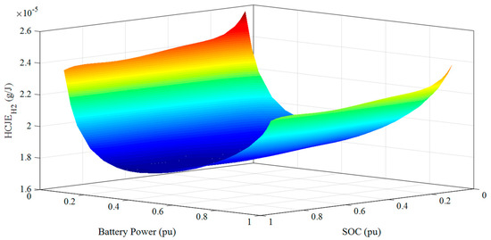 Figure 13 displays the curve of the battery’s equivalent hydrogen consumption (HCJEbat) after simulating the equations mentioned in the previous section. Based on the figure, the minimum quantity of hydrogen consumed is observed when the state of charge is approximately 0.9 and the FC output power (PFC) is around 0.4 per unit (pu).