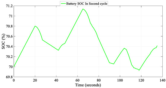 Figure 18 displays the SOC of the LFP battery. The figure illustrates that the process of charging and discharging the battery is executed proficiently. It is evident that, even though 4.40 kilojoules of regenerative braking energy is received, the disparity between the initial and final battery charge status remains approximately 0.4%. The results demonstrate that the suggested approach effectively prevents the battery SOC from increasing. The SOC difference at the end of the robot’s maneuver is consistently maintained at a positive level (+0.4%) to ensure that the battery remains unaffected by various operating conditions and does not discharge.