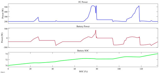 Figure 17 and Figure 18 display the output power and SOC of the LFP battery. Table 3 indicates that the battery’s maximum power for charging or discharging is 450.81 watts. Figure 17 demonstrates that battery charging only takes place when the fuel cell is operating at its most efficient level of energy consumption. This is supported by the relationships discussed in earlier sections, which show that this charging is justified as it helps to minimize fuel usage. Furthermore, it is important to mention that throughout this timeframe, the battery has successfully accumulated 4.4 kilojoules of energy generated through regenerative braking.