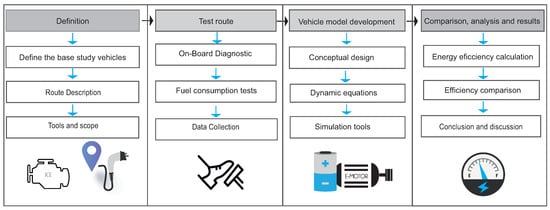 Figure 1 is divided into four main phases: definition; test route; vehicle model development; and comparison, analysis, and results. In the definition phase, the base study vehicles are defined, the route is described, and the tools and scope of the study are determined. The test route phase includes on-board diagnostics and fuel consumption tests for data collection. In the vehicle model development phase, conceptual analysis is carried out, dynamic equations are established, and simulation tools are used. Finally, in the comparison, analysis, and results phase, energy efficiency is calculated, efficiencies are compared, and the conclusions and results obtained are discussed. The methodology used is intended to show the impact of combustion vehicles on fuel consumption and the feasibility of using electric vehicles in the same routes and the respective comparative.