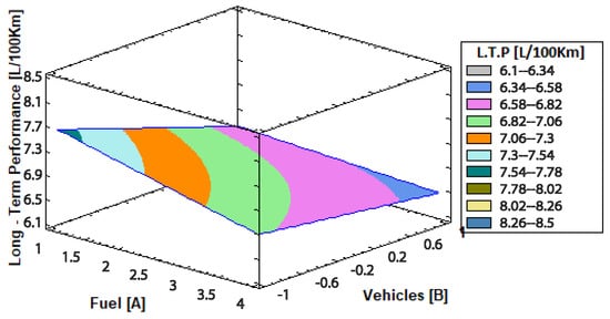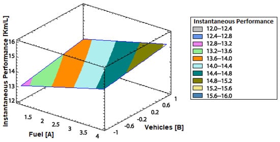 Table 2, and the Vehicles [B] axis ranging from −1 to 1, correlating with vehicle models such as the Hyundai Accent and Chevrolet Sail. The vertical axis quantifies the performance of these combinations in km/L, showcasing how fuel efficiency varies with changes in fuel type and vehicle model.
