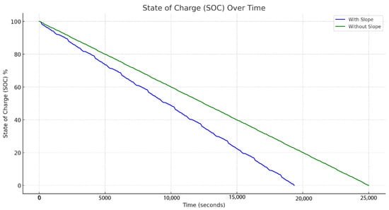 Figure 11, reveals the battery’s charge depletion over time under two distinct conditions: driving with and without slope variations. In both scenarios, the SOC declines steadily from a full charge, but the decline is notably quicker when encountering slope variations, as evidenced by the steeper slope of the blue line in the graph. This quicker depletion is attributed to increased energy demands, especially when navigating uphill gradients that require more power to overcome gravitational forces.