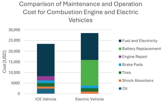 41]. In total, the maintenance costs for the electric vehicle amount to USD 15,880 at 300,000 km. For the internal combustion engine vehicle, maintenance costs include oil changes that occur every 5000 km at a cost of USD 40 each, replacing shock absorbers at USD 200 every 60,000 km, replacing tires at USD 280 every 50,000 km, and replacing brake pads at USD 200 every 50,000 km. Additionally, this vehicle requires an engine repair at 300,000 km, costing USD 2000. In total, the maintenance costs for the internal combustion engine vehicle amount to USD 8280 at 300,000 km, as is shown in