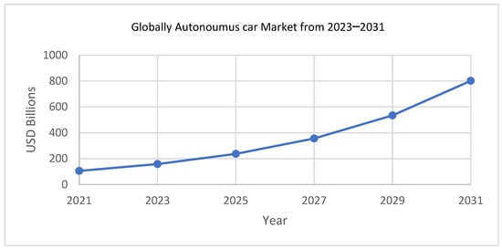 Autonomous vehicles, which are sometimes referred to as self-driving automobiles, have enormous growth potential in the automotive industry, as shown in Figure 2. Several automakers are developing self-driving vehicles, such as Tesla, Audi, Waymo, General Motors, Mercedes-Benz, and Nissan [20,21]. Therefore, self-driving technology has been a major research topic recently. Because it can revolutionize transportation, it is regarded with both excitement and caution. Among the many benefits of self-driving cars is their ability to decrease human error and increase traffic efficiency. By providing a means of independent transportation that eliminates the need for driving, these cars can also benefit older people and those with visual or hearing problems [22,23,24,25,26].