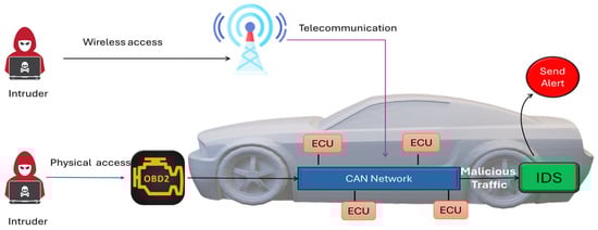 Recently, vehicle system security has gradually become a key matter due to the expanded reliance on vehicle systems particularly with the advance of the Internet of Vehicles (IoV) in smart cities. In [10], their effort aims to defend both internal and external vehicular networks by creating an IDS that can identify different forms of threats. Figure 3 depicts the design of an IDS-protected vehicle as well as the usual assault scenario. By transmitting malicious traffic packets, Cybercriminals can use wireless interfaces to launch external assaults on external vehicle networks and the On-Board Diagnostics II (OBD II) interface to launch internal attacks on IVNs. Thus, both IVNs and external networks should use the recommended IDS.