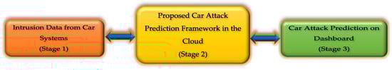 - Stage 2: After the data were gathered, they were sent to cloud servers for processing and storage so that they could be organized for the study of dangerous online activity data. From there, it was possible to forecast automobile or vehicle attacks, as shown more simply in Figure 3;