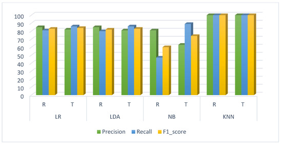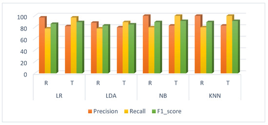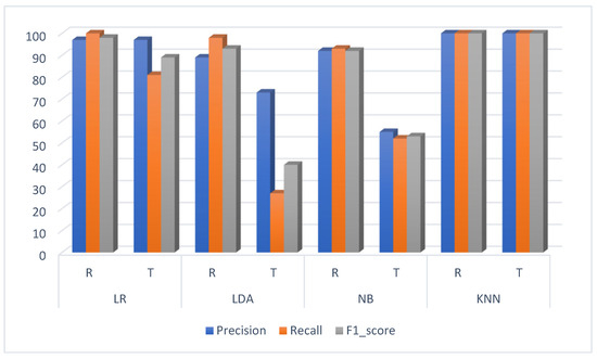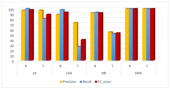 Similarly, Table 4 and Figure 8 offer a comparative analysis of the results obtained without employing resampling techniques for both normal (R) and attack (T) instances. These initial evaluations serve as a baseline for understanding the effectiveness of the ML models in their raw form without any pre-processing techniques. In contrast, Table 5, Table 6 and Table 7 along with Figure 9, Figure 10 and Figure 11, showcase the outcomes achieved by incorporating various resampling methods such as NearMiss, ROS, and Tom-Links, respectively. By integrating these resampling techniques with the ML models, a hybrid approach is formed, aiming to enhance the classification performance across all tested detection metrics.