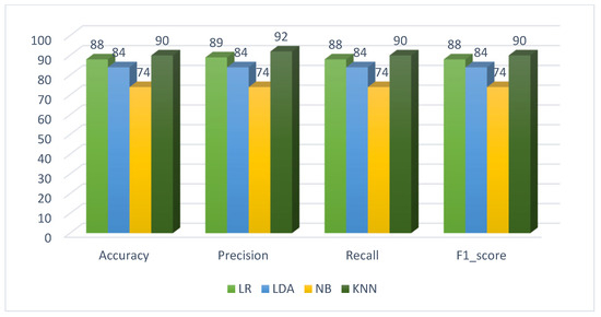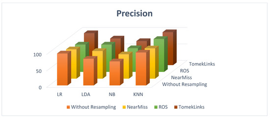 Table 11 compares the performance of algorithms (LR, LDA, NB, K-NN) with different resampling techniques. Without resampling, LR performs best at 97, while K-NN maintains perfect performance across all techniques except NearMiss. Tomek Links generally maintain or slightly improve performance, especially for LR, LDA, and NB. NearMiss typically reduces performance across all algorithms, while ROS can significantly enhance K-NN but tends to lower performance for others.