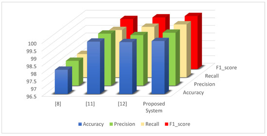 The quantitative comparison shown in Table 15 clearly shows that the suggested system performs noticeably better than the current systems. By significantly outperforming the previous systems in terms of accuracy, precision, recall, and F1_Score, the suggested method achieves an astounding 100% performance. From the results, the proposed system achieves an accuracy, precision, recall, and F1_Score of 100%, outperforming the state-of-the-art methods. In contrast, the system proposed in [8] achieves an accuracy of 98.10%, which is 1.9% lower than our system. Similarly, the systems proposed in [11,12] achieve accuracies of 99.96% and 99.93%, respectively, which are still 0.04% and 0.07% lower than our system, as clarified in Figure 19. These results indicate that our proposed system is more effective in achieving high accuracy and reliability.