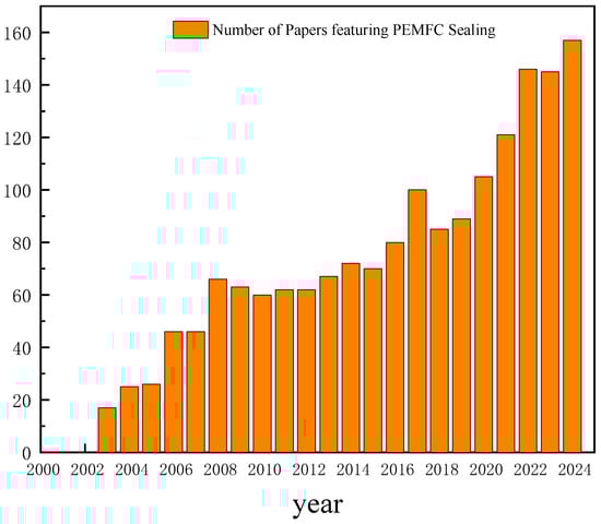 Due to the global energy crisis and the pollution caused by burning fossil fuels, clean energy has become the focus of attention worldwide [1,2]. Vigorous development of new energy vehicles, led by electric vehicles, has become our national strategy as well as an international consensus. Hydrogen energy is the cleanest energy in the world, it is flexible, abundant, and conducive to sustainable development, and it can also be used for long-distance transport operations and the development of energy-consuming industries [3]. The proton exchange membrane fuel cell (PEMFC) is an electrochemical device that converts hydrogen energy into electricity with high power density, high conversion efficiency, zero emissions, and low noise [4]. Compared to other types of fuel cells, the PEMFC is able to operate in dry or low relative humidity conditions [5], and it is typically an “environmentally friendly” fuel. The PEMFC has a variety of fuel sources and can also use fuels such as methanol [6]. Therefore, the PEMFC is considered to be a good choice for replacing conventional fuel engines, but its material cost and manufacturing cost are high. Its main fuel source, hydrogen, is more difficult to prepare and store [7]. Therefore, the PEMFC is considered to be a good choice to replace the traditional fuel engine. The PEMFC mainly consists of end plates, insulating plates, a collector, a bipolar plate (BPP), gaskets, and membrane electrodes. Among them, the BPP and membrane electrodes, as the core components of the fuel cell, have been research hotspots in the current field, compared to which the sealing materials and performance of the cell are neglected research objects [8]. However, in the overall structure of the fuel cell, serious safety hazards arise due to the emergence of dimensional and shape errors in various components, as well as the occurrence of sealing structure failure during assembly or startup, resulting in the mixing or leaking of reactant gases. Therefore, the stability of the cell sealing is crucial to the performance and safety of the electric reactor. Major automotive companies around the world have been conducting high-cost and long-term research and development on hydrogen fuel cells, and the number of papers on the topic of cell sealing has been increasing year by year, as shown in Figure 1. Ye et al. [9] of Wuhan University of Technology outlined the types of sealing structures for membrane electrode assemblies (MEAs) of PEMFCs, pointing out that the sealing-frame-wrapped membrane electrode type is more convenient in terms of electric stack assembly and that the rigid protective frame sealing structure has a broader application prospect. Qiu et al. [10] from Shanghai Jiao Tong University reviewed the effect of pressure on sealing from the aspect of power reactor assembly technology, derived the concept of seal degradation from the form of gasket degradation, and outlined the improvement model of sealing structure. Considering the importance of sealing in the assembly and use of fuel cells, as well as the emergence of various new methods and technologies in recent years, it is crucial to reflect the development of this field in a more comprehensive and timely manner. In this paper, a systematic review is made on the sealing research of PEM fuel cells, focusing on the influence of the assembly components and process on the sealing performance of the battery. The aim of this paper is to sort out and summarize the existing simulation experiments, with a view to generating new sealing technologies, which can ultimately promote the development of sealing research on PEM fuel cells.