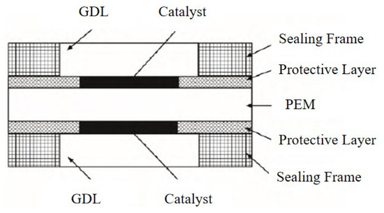 A rigid wrapped frame refers to a structural whole after the rigid frame at the edge of the membrane electrode structure is compressed and combined with other sealing materials or thermoplastic materials [9,27,28,29,30,31]. The rigid wrapped frame can provide some sealing effect after compression; its structure and dimensions have a significant influence on the compression rate of the membrane electrode after the assembly of the electrostack. Its rigid material and sealing material determine the minimum contact resistance between the membrane electrode and the BPP; and at the same time, it can protect the membrane electrode from being damaged by excessive compression during operation. As shown in Figure 5 [9], Xu et al. added a protective layer on both sides of the PEM. The material of the protective layer may be polytetrafluoroethylene for waterproofing and air permeability. Adding a rigid frame to the outside of the protective layer produces little compression damage, but reactive gases can also overflow from the frame gaps. Therefore, it is necessary to add rubber sealing gaskets to the surface of the rigid frame to enhance the sealing. The rigid wrapped frame needs to use a variety of rigid materials and sealing materials. Its size and structure also plays a key role in the performance of the battery cell; therefore, to complete the overall assembly, the rigid wrapped frame components need to have an accurate size and structure.