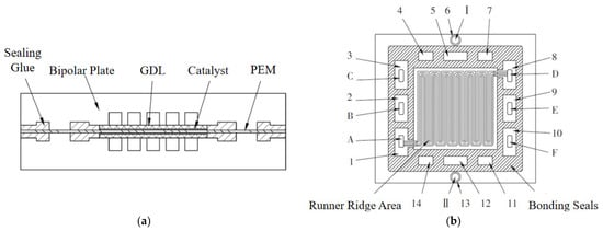 Conventional PEMFCs have BPPs and membrane electrodes that are independently fabricated and assembled under assembly pressure and then sealed against oxygen, hydrogen, and coolant by seals, making the wire-seal structure easy to process and simple to visualize. However, there are manufacturing errors between components and single seals, and the force stability of the reactor is poor during long-term operation, which makes it difficult to ensure the consistency of the whole reactor. Yin Jun et al. [34] from Tongji University proposed an integrated sealing design as shown in Figure 8a, in which the BPP and the membrane electrode are formed into a single component by injection molding, and the sealant infiltrates into the GDL to ensure the parallelism and distance between the membrane electrode and the BPP on both sides. As shown in Figure 8b, the function of the 1–14 protruding platform on the pole plate is to fix the membrane electrode, protect the carbon paper from being excessively compressed, and ensure the flatness between the two plates. The height of the tab on the polar plate is calculated as follows: