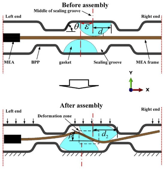 In Equation (4), is the original thickness of the GDL on the same side as the polar plate; is the original thickness of the CL on the same side as the polar plate; and denote the compression rates of the GDL and CL on the same side as the polar plate, respectively; is the depth of the sealing groove; and is the thickness of the resin framework.