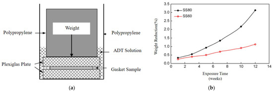 Gasket degradation under constant load: (a) schematic diagram of compression load test; (b) weight loss of gasket samples at 60 °C and 80 °C for different exposure times. Reprinted with permission from Ref. [41]. Copyright 2017 Elsevier.