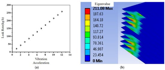 Due to the presence of rough surfaces, automotive fuel cells are inevitably subjected to vibration and shock loads during operation, and the stacks generate compressive and excessive shear stresses [56]. The forces generated by vibration are random and difficult to regulate quantitatively. Hou et al. [57] studied the airtightness change in fuel cell stacks under prolonged vibration using a 150 h intensive vibration test, and measured the airtightness change of the stacks of 560 cells under the condition of 50 kPa of pressure; the result was that the hydrogen leakage rate was increased by 50%, which was due to the destruction of the internal sealing structure of the reactor as a result of long-term vibration. As shown in Figure 13, Deshpande et al. [58] detected the resonance at the edge of the gasket using finite element analysis and obtained the location of the possible hydrogen leakage (Figure 13b). Through further investigation, it was found that the torque of the bolts near the point of resonance was about 75% of the original torque, and the contact pressure started to increase with vibration. Therefore, it was found that the gasket leakage rate increased as the vibration intensified (Figure 13a). Rajalakshmi et al. [59] conducted vibration tests on the PEMFC power pile under considered operating conditions; they found that the change in vibration frequency affects the change in bolt torque, which was reduced by 20% within a frequency range of 50–150 Hz, and, hence, the overall sealing of the power pile was also enhanced.