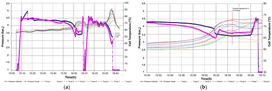 Variation in core temperature and pressure with time: (a) pressure of the reactant gasses vs. cell temperature during the last hours of operation; (b) expanded view of (a) between 15:50 and 16:10. Reprinted with permission from Ref. [52]. Copyright 2007 Elsevier.