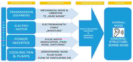 In EV powertrains, the main sources for NVH are the electric motor, the power inverter, and the transmission with a gear reducer [] and, if present, the cooling fan and pumps, as seen in Figure 1. All of the individual parts have acceptable NVH on their own, but challenges arise when they operate in conjunction.