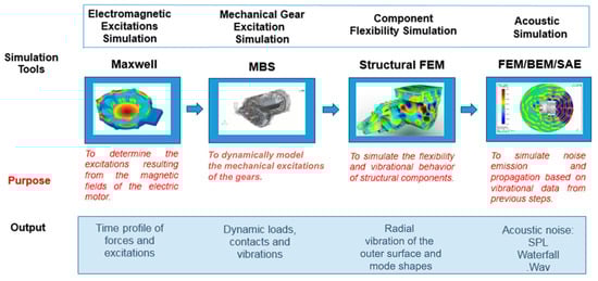 The powertrains of EVs are very complex energy chains for the simulation of radiated noise and require many different methodologies and tools. The typical powertrain in an EV consists of an electric motor combined with a reduction gear. To accurately predict the noise generated by the overall powertrain, it is necessary to consider the dynamic performance and acoustic characteristics of both the electric motor and gear reduction mechanism as a whole. How those two main components—the electric motor and the gear reducer—are integrated with each other has a major influence on the noise and vibration character of the EV powertrain [].