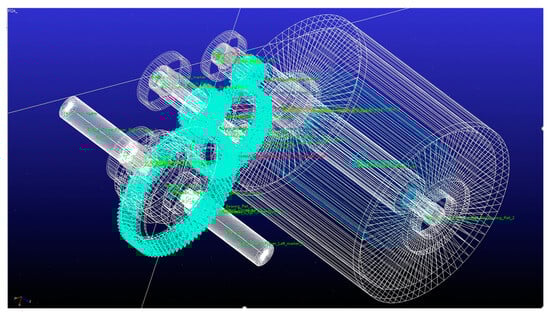 At the beginning of a multi-body dynamic simulation, the electric motor is a critical component of the powertrain and is included in the system model to describe all of its complex dynamics. This simulation also extends to address the impact of the electric motor on all other powertrain parts, such as gears and shafts, covering rotational dynamics, torque generation, and any flexibilities in motor mounts or couplings. The simulation stretches beyond regular rigid body dynamics and incorporates the flexibility of bodies, emulating the actual dynamic behavior of motors. The interactions among the dynamic loads, vibrations of the gears, and contact forces are precisely represented by a corresponding mechanical model (Figure 4) [].