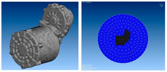 Meshing and acoustic field simulation of an electric motor performed in Actran. The left image shows the meshing of the electric motor for detailed vibro-acoustic simulation, while the right image illustrates the acoustic field around the motor.