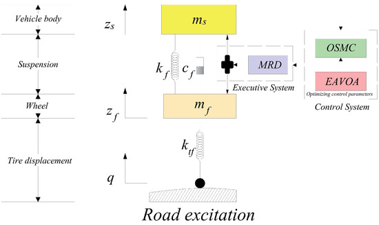 The rest of this paper is structured as follows: Section 2 elaborates on the construction of mathematical models for automotive suspension dynamics and the structure and working principle of the suspension actuator MRD. Section 3 explains the entire design process of OSMC control. It also outlines how the EAVOA is utilized for optimizing the control parameters. Section 4 conducts simulation experiments to validate the control performance of the designed control strategy. Section 5 discusses the advantages of the control strategy proposed in this article over other SASS control strategies. Section 6 summarizes the conclusion.