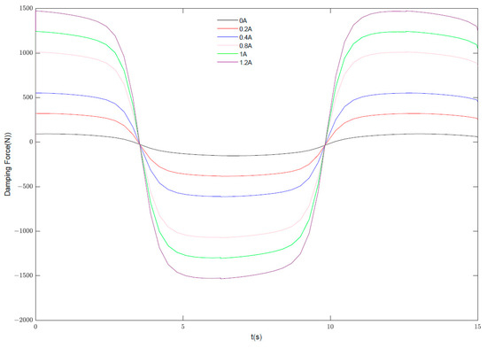 This paper conducts simulations of the damper model using the hyperbolic tangent model through MATLAB/Simulink (R2018b) in Figure 2. Additionally, Figure 3 demonstrates that the simulation curve of the damping force for the hyperbolic tangent model fits smoothly and clearly over time, showing significant differences in the damping force generated by different current inputs. Therefore, the MRD can meet the requirements as an actuator.