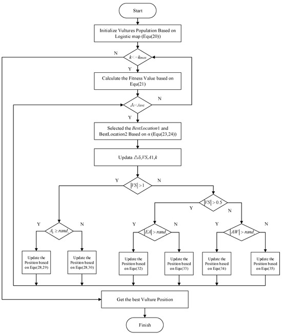 The AVOA is an intelligent optimization algorithm inspired by collective intelligence and the foraging behavior of natural biological species. It possesses excellent global search capabilities and search speed [28,29]. However, the AVOA exhibits population overlap during initialization, and, during the execution process, it requires the specification of multiple fixed parameters to address the selection of vultures in different states of hunger. The initial overlap issue and fixed parameters of the above-mentioned parameters can lead to the algorithm’s inability to adjust comprehensively with the iteration, resulting in a local optimization problem. To addresses these two drawbacks of the AVOA, this paper introduces improvements, and the EAVOA is applied to the optimization of the OSMC.