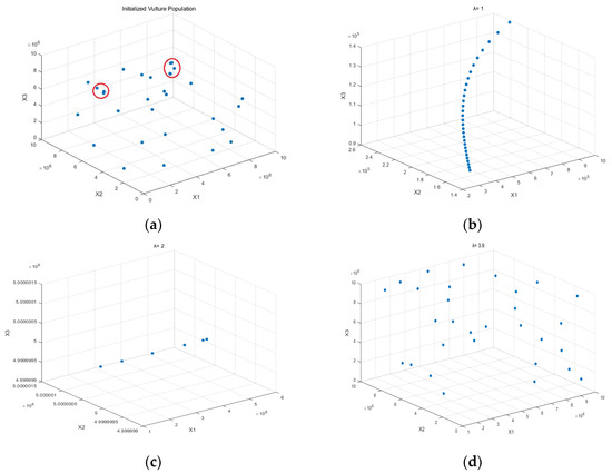 In the initialization process of the vulture population, an overlap phenomenon is observed, as illustrated in Figure 5a, where the overlap is indicated by the red circle. The distribution of the vulture population varies for different values of , as shown in Figure 5b–d. When , the population distribution is optimal without any overlapping.