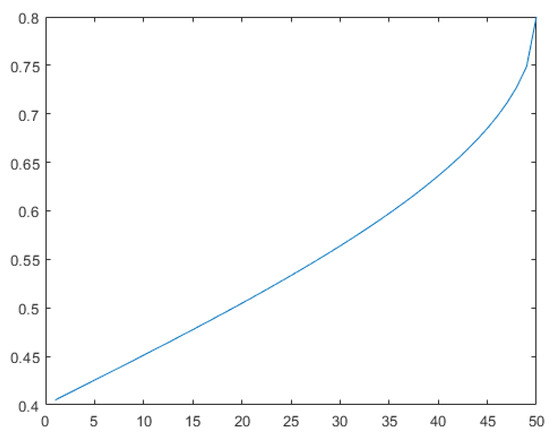- After the vulture population is established and their respective fitness values are computed, the best solution is selected as the first group, embodying the optimal vulture value. The optimal solution for the second group is chosen as the second-best option. These two groups display two directions of vulture operation, and their formulae are as follows:where represents the current position. The value of is independent within the range . is the adjustment coefficient. In the AVOA, if the adjustment coefficient () is set to a fixed value, its value cannot be adjusted with iterations to enhance the search performance. When is a large value, it indicates a strong search capability. Where is a small value, it suggests the ability to conduct a broader search. To ensure the accuracy of the search, the extensive search is required and should be set to a smaller value in the initial stages. Once the search range is determined, the stronger search capabilities are needed and should be relatively large. Therefore, a nonlinear function is employed to optimize this value, and its formula is as follows:where represent the max and min values of the change interval and denotes the maximum number of iterations. The value of with iteration numbers is illustrated in Figure 6.