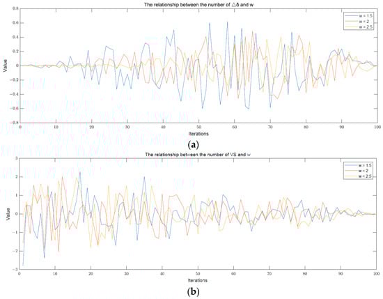 To better illustrate the relationship between perturbation values and the perturbation factor, the is set to 1.5, 2, and 2.5. The relationship between the and is depicted in Figure 7a. The relationship between the and is displayed in Figure 7b, and the corresponding RMS values are shown in Table 1. When , the and can reach a balance; the will not be too large, which ensures the searched for food in a larger range.
