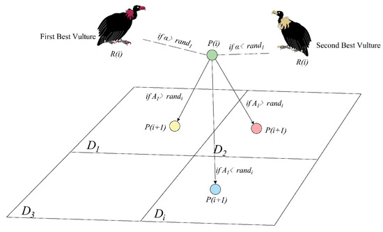 where Equation (25) elucidates the two search settings for vultures in the case of abundant energy: searching in the nearby region and searching in the distant region. represents the position vector of the current iteration, while indicates the position vector in the next iteration. describes the search speed of vultures in the nearby region. demonstrate the upper and lower limits for setting parameters, respectively. Meanwhile, to improve the fixed setting of the in the AVOA, this paper transforms it into a region parameter, as shown in the following formula: