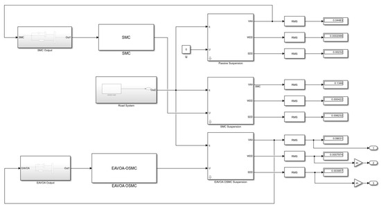 To validate the control performance of the EAVOA-OSMC, this paper constructs the model of the PSS, the SASS with the SMC controller, and the SASS with the EAVOA-OSMC controller in MATLAB/Simulink (R2018b), as displayed in Figure 10. Meanwhile, the suspension parameters and the traditional SMC control parameters are shown in Table 2.