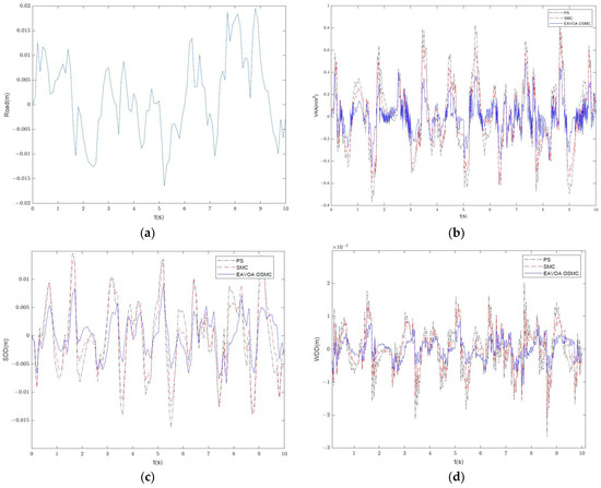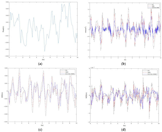Meanwhile, the suspension is also operated on a D-grade road surface (Figure 12a) for further comparison. The VAA, SDD, and WDD of these three simulation models are depicted in Figure 12b–d.