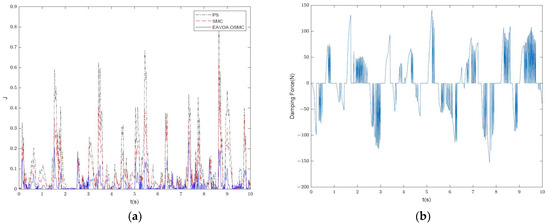 Table 3 illustrates the optimized control parameters for the EAVOA when the suspension system with the OSMC operates on B-grade and D-grade road surfaces. The corresponding comprehensive evaluation metric and the damping force of the suspension control are presented in Figure 13a,b under B-grade road surface conditions, and the optimized parameters of the controller are indicated in Table 4.