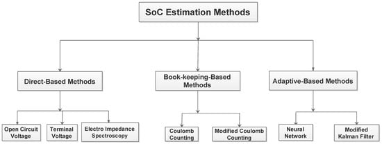 - SoC estimation methods for batteries are discussed, and much focus is given to the different methods applicable. Specific application approaches in the literature are presented based on different SoC methods.