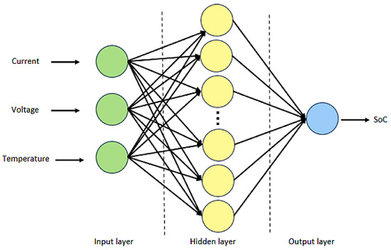 | Feedforward Neural Network (FNN) | 2–4 | Supervised Learning | Voltage, Current, Temperature | Backpropagation | Root Mean Square Error (RMSE), Mean Absolute Error (MAE), Coefficient of Determination | [142,143] |