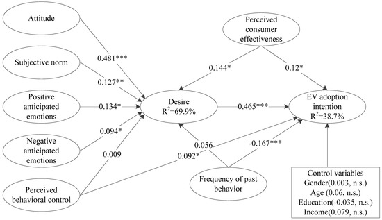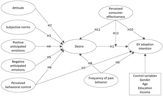 Furthermore, the MGB posits that PBC can enhance an individual’s desire [17]. A variety of studies have established a significant and positive association between PBC and desire. For example, reference [39] found that PBC positively affects the desire of bicycle travelers. Drawing on the empirical findings from prior research, we anticipate that consumers’ motivation to adopt EVs for the purpose of environmental protection will be heightened when they perceive themselves as having adequate resources or capabilities to engage in the adoption behavior. Consequently, we propose the following hypotheses:
