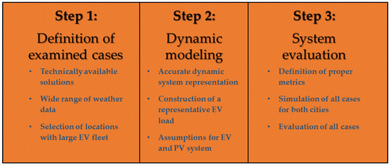 This section presents a methodology framework developed to evaluate and compare the available options for using solar energy to recharge light-duty EV batteries. Figure 1 provides an overview of the methodology followed.
