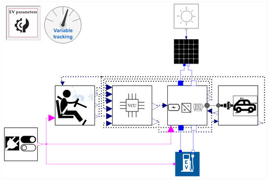 Without any PVs mounted on the EV, the EV battery can be connected directly only to the charger. This model represents all cases where power to the EV is supplied solely through a charger (Cases 1 and 3). Specifically for Case 3, it is assumed that an independent PV system is installed and connected to a stationary battery energy storage system (BESS). The operation of this BESS is not simulated, as it is considered to be able to store and supply the full contribution of the PV system. The energy produced by the PV system is subtracted from the amount of energy supplied by the grid.