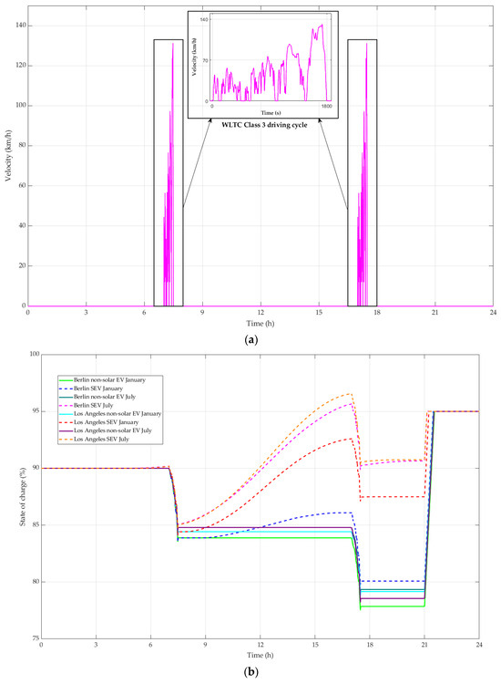 Vehicle performance. (a) Velocity profile of the applied driving cycle. (b) State of charge under multiple operating conditions for solar and non-solar EVs in Berlin and Los Angeles.